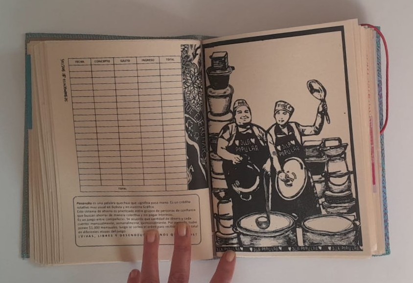 En el local donde comenzamos a trabajar en la Gráfica convivían otros espacios del MTD; el merendero, las asambleas, el acopio de mercadería, la venta de ropa donada para la feria, los bingos y las ollas. Nos llevaba mucho tiempo armar y desarmar cada vez que iniciábamos la jornada, pero éramos muchas, diversas y a veces no siempre las mismas. Empezamos haciendo cuadernos pintados y anillados, luego cosidos, bordados y encuadernados, armados uno a uno artesanalmente con diseños únicos que reflejaban nuestros diversos orígenes.